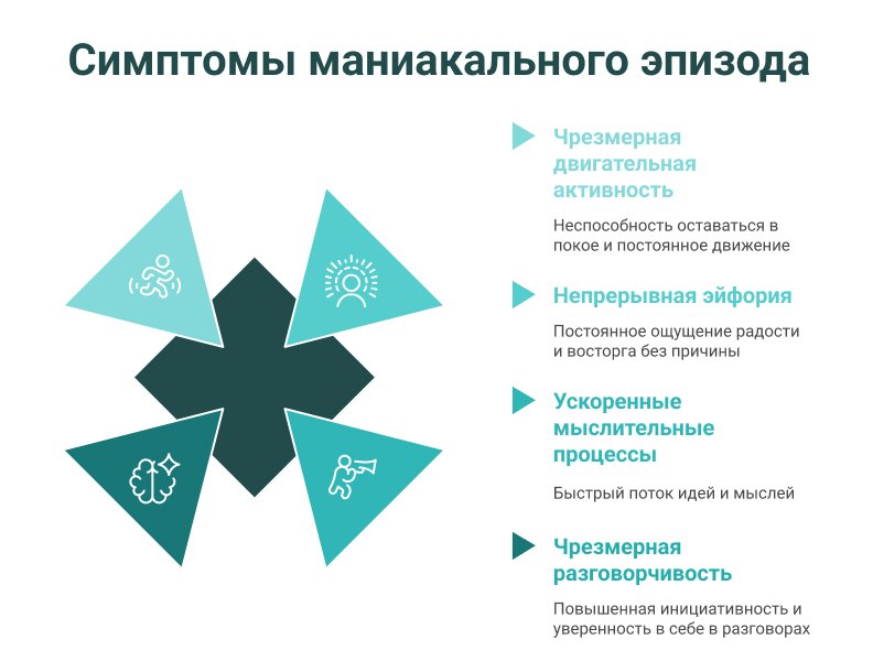 Во время мании человек переживает необычайный прилив энергии и эмоционального возбуждения. Его поведение становится активным, иногда даже хаотичным, мысли ускоряются, а настроение достигает неестественно приподнятого уровня.